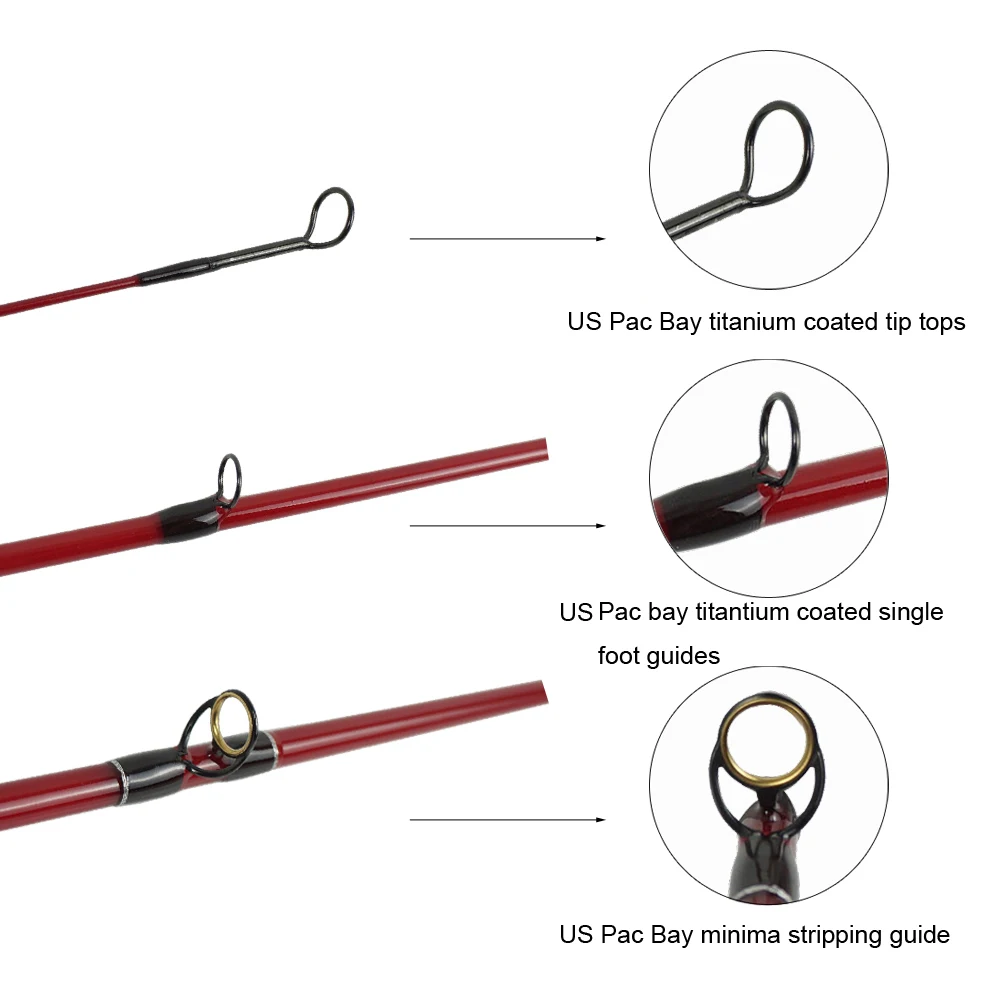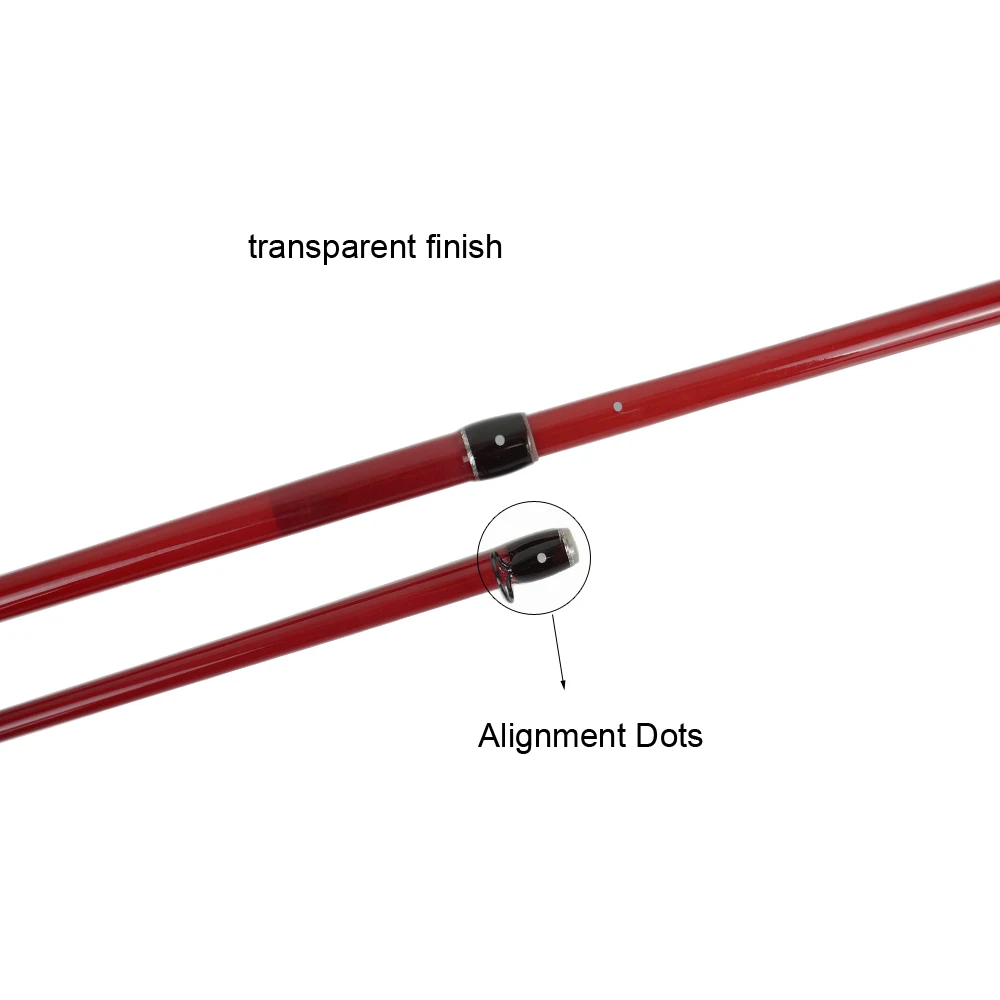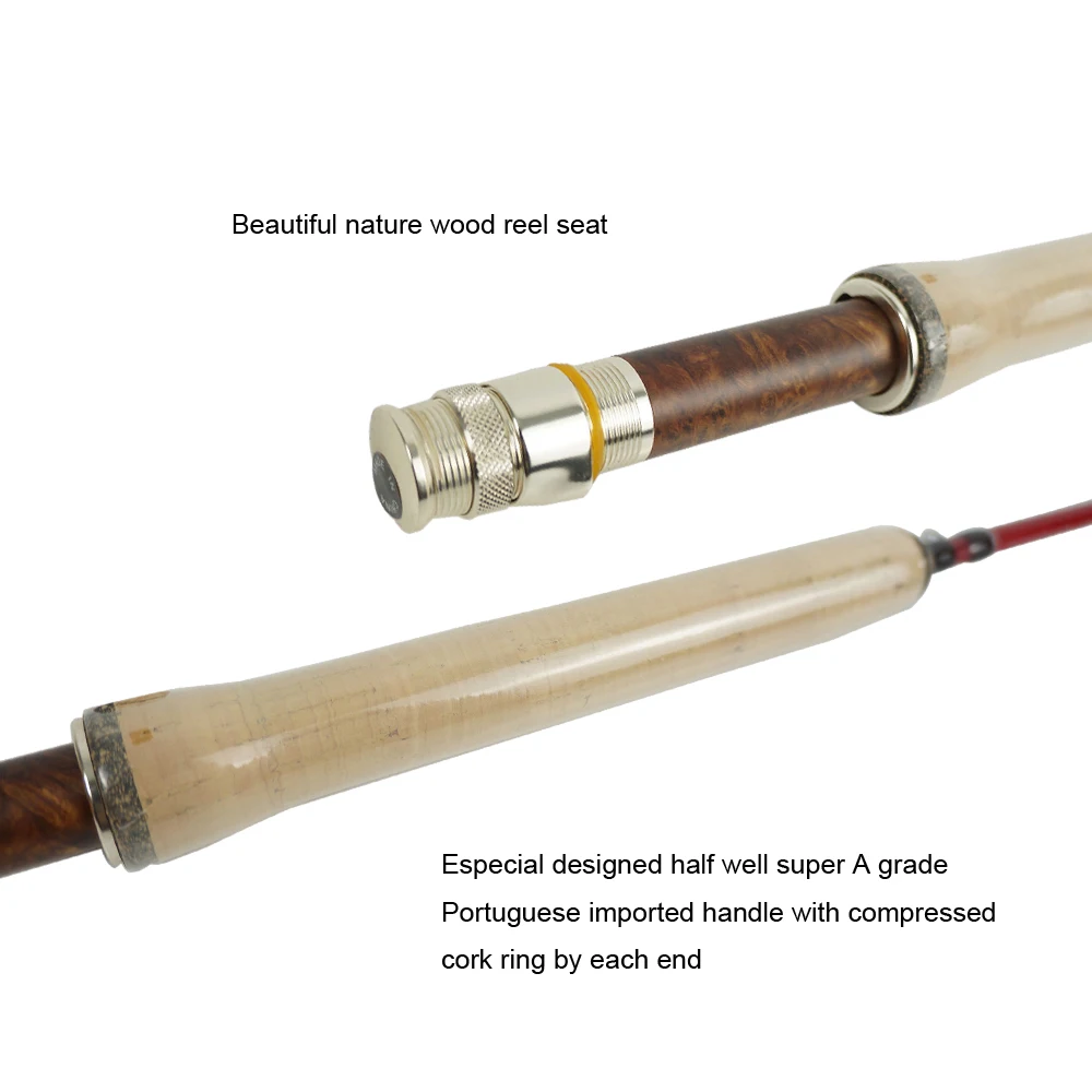 Medium action, Pacific Bay titanium coated single foot guide, AAA half well cork handle with compressed cork ring by each end, beautiful nature wood reel seat, 4 attractive finish: transparent yellow, transparent orange, transparent brown, transparent dark green. And with logo "River runs". Proved by our fly fishing guides from Denver to Montana in all the small creeks and rivers, casting accurately with delicate presentation, classic bends, the very best fibreglass rods in the market.